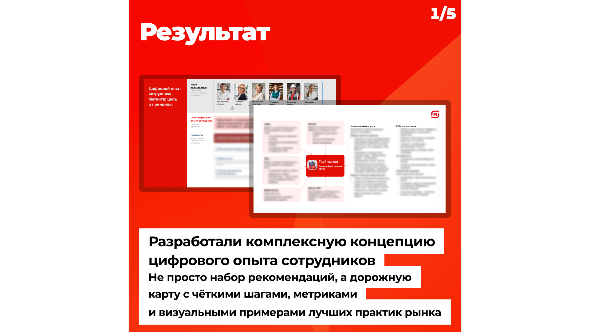 В рамках проекта разработали комплексную концепцию цифрового опыта сотрудников — не просто набор рекомендаций, а дорожную карту с чёткими шагами, метриками и визуальными примерами лучших практик рынка. Документ основан на анализе текущего цифрового опыта с учётом сильных сторон и зон развития ключевых систем для сотрудников.